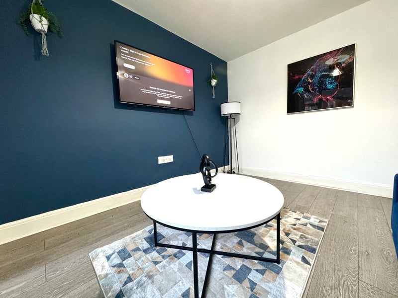 Inside, the house features four generous, equally sized double bedrooms, reducing the chance of disputes over room selection. The property offers a separate kitchen and a comfortable living room that has recently been updated with a new 55-inch smart TV, fresh wall art, and a stylish feature wall, creating a modern and welcoming social space.