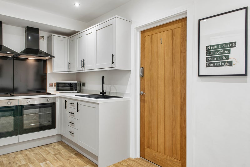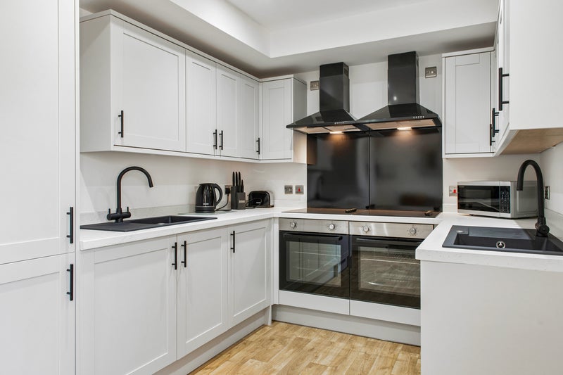 The communal kitchen is brand new, with modern, marble effect work tops, high spec appliances including : washer/dryer, two ovens with modern extractor fans above, free standing fridge freezer, microwave, kettle & toaster.