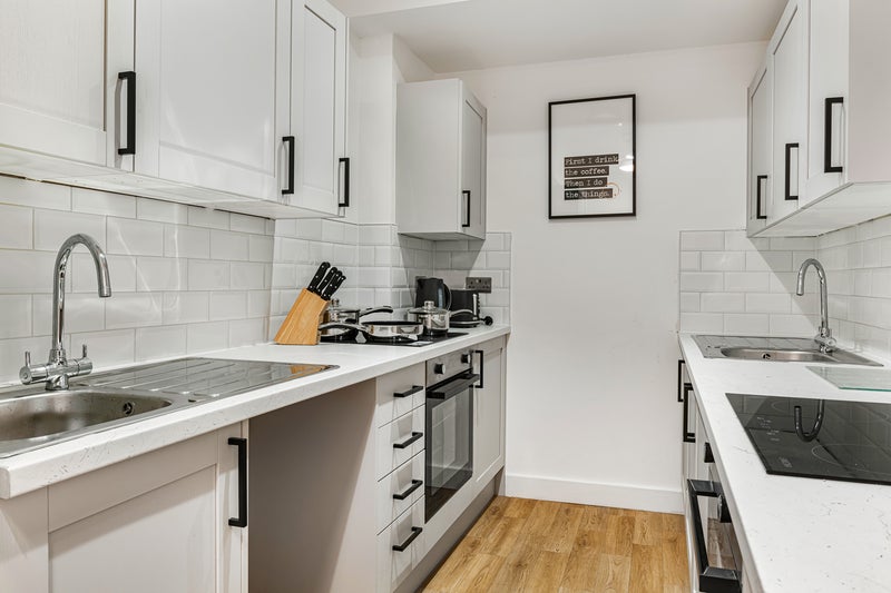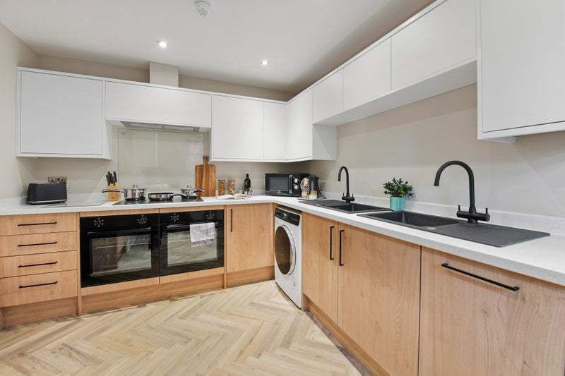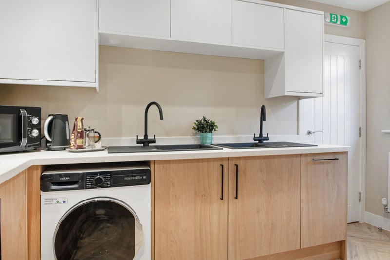 The communal kitchen is brand new, with modern, marble effect work tops, high spec appliances including : washer/dryer, two ovens with modern extractor fans above, free standing fridge freezer, microwave, kettle & toaster.