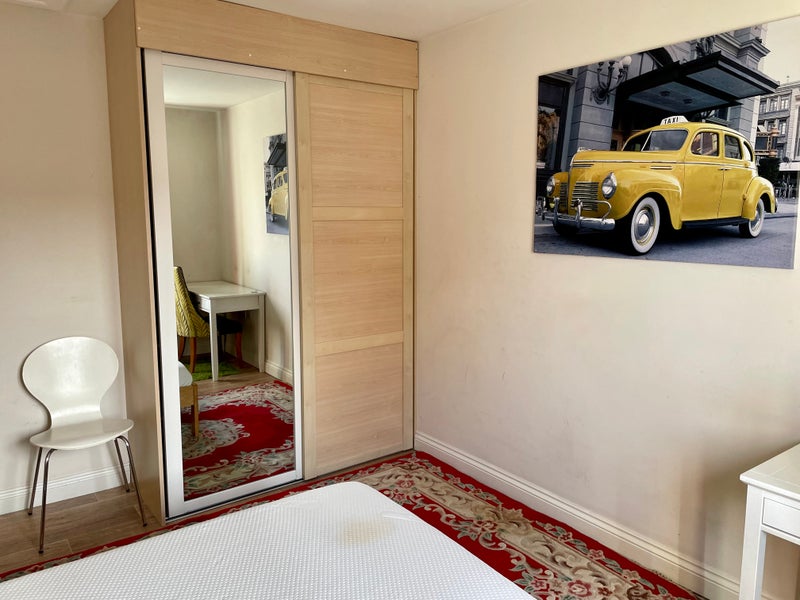 Large double with fitted wardrobe, desk and chair, double bed, and private ensuite with shower, toilet, and sink. Spacious, bright, and quiet on the 3rd floor.