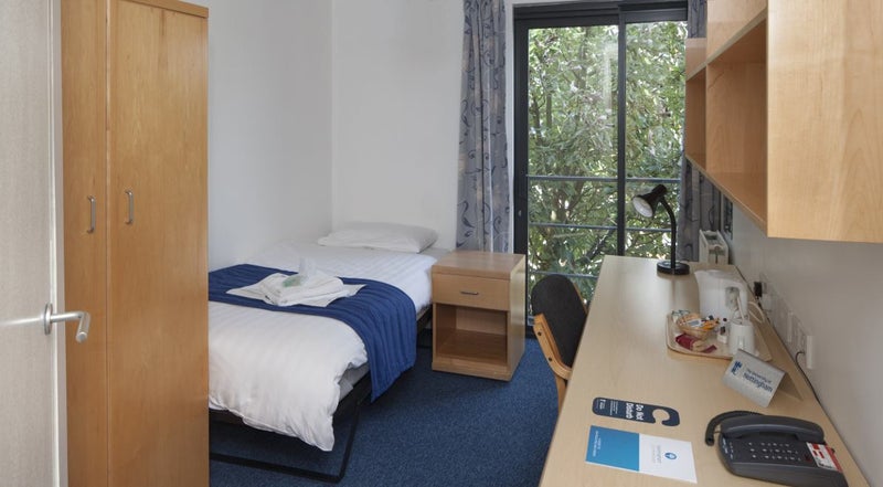 The room includes a single bed, large desk, wardrobe, ensuite with shower and mini fridge. There are also pantries within the hall with microwaves, kettles and large sinks. This room in particular is 2 doors down to the nearest pantry, unlike many other rooms that are much further.