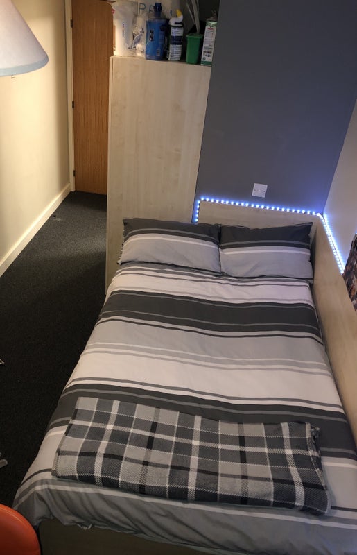 This is a premium range 1 ensuite at St Peters court with a 3/4 bed and shared kitchen and lounge space with 5 other people. You also have access to a spacious common room with a pool table, table tennis, study room, well equipped free gym and patio with benches and tables. Wifi and bills are included in the price you pay. The room has lots of storage space including under bed storage, a large wardrobe, shelving and drawers. Also a desk, desk chair, notice board, mirror, radiator and curtains are included. The bathroom has a private shower room, sink, toilet and mirror. Some kitchen features include an oven, microwave, fridge and freezer space, cooking hobs, kettle, toaster, bin, dustpan and brush, iron, mop and bucket, vacuum cleaner, ventilation system, breakfast bar with stools, ironing board and a sofa and table in the lounge area. This accommodation is very ideal as it is located close to Jubilee campus and is only a short walk from city centre, there are many close shops nearby like Subway, Lidl, Dominos and Aldi. Unite students also provides a free bus service.