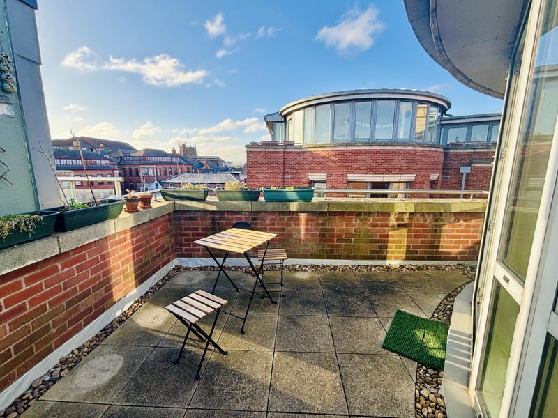 2 x terraces: one overlooking Town Hall/Market square and the other one over the pretty St Mary's Square. It's wonderful out on the balconies in the summer time!