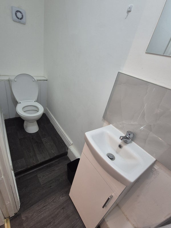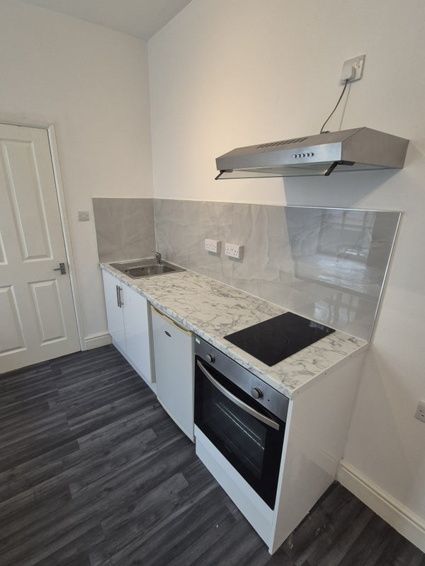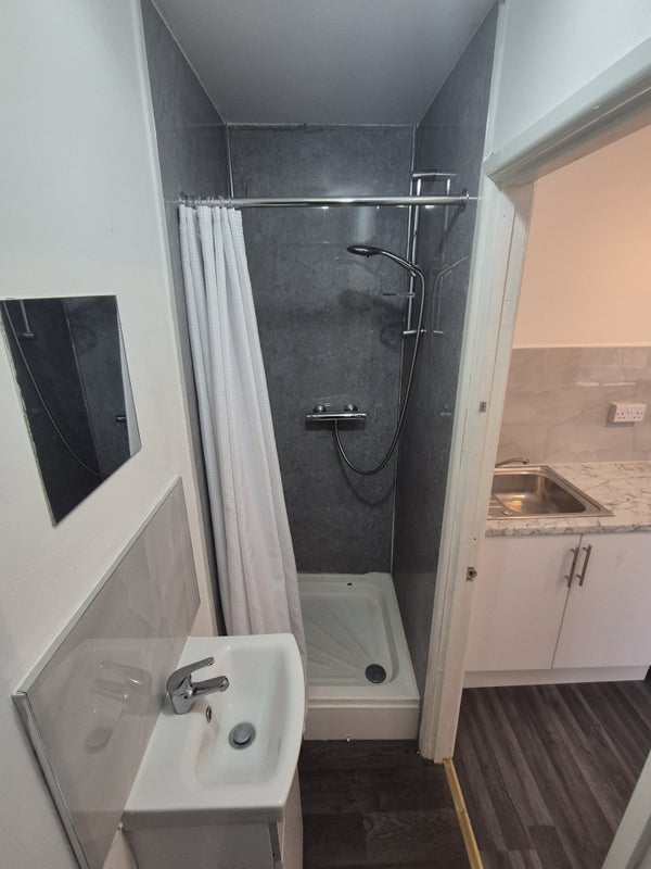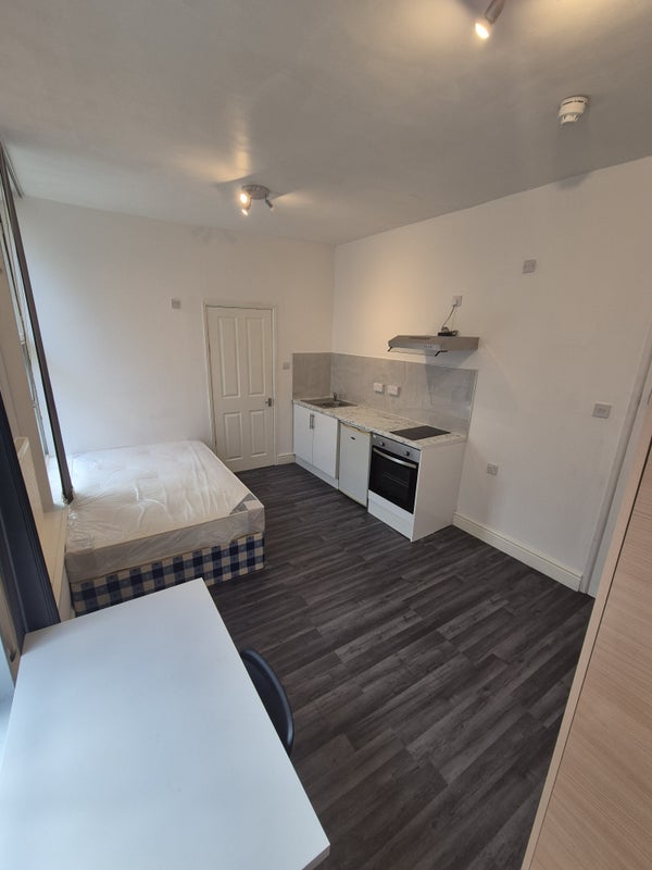 Studio comes with Newly Small single bed/mattress, fitted wardrobe, desk, chair, fridge freezer, & a fully fitted Hob. Washing facilities are in a shared kitchen space sharing with only 2 other people.