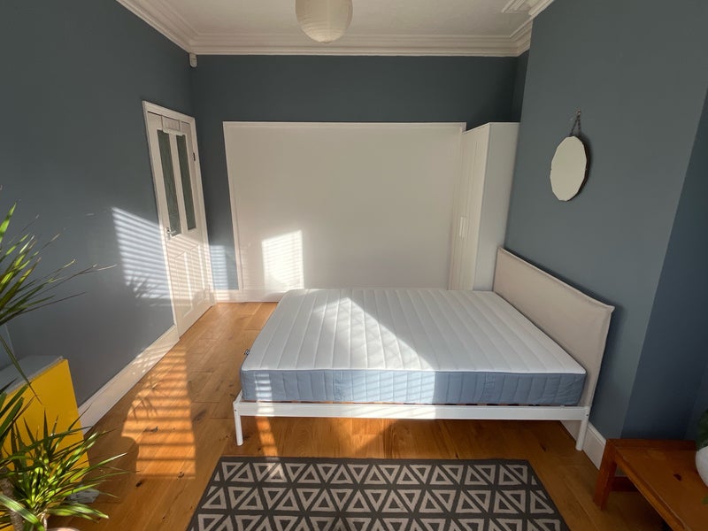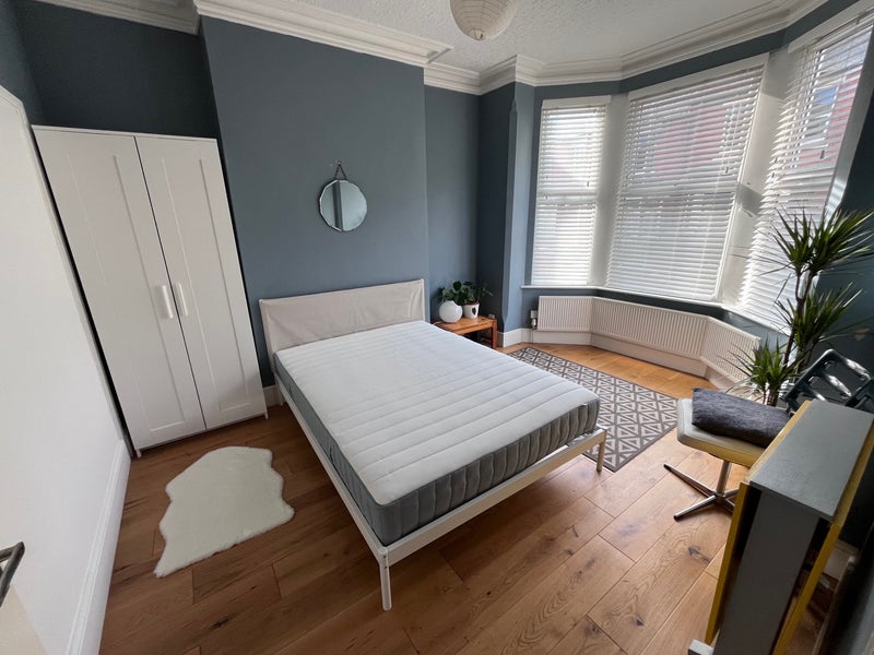 The room is furnished with a double bed and wardrobe, with high ceilings and a large bay window giving it a light, airy feel. There is space for a small desk if required.