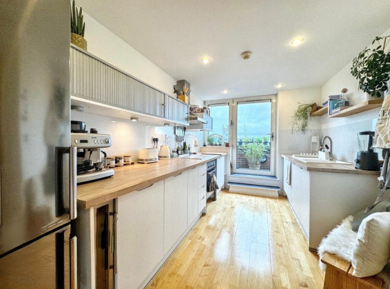 Hard flooring, wall and base units wooden work top, ceramic sink with swan neck tap, integrated wine cooler, dishwasher, space for fridge-freezer, induction hob, oven, extractor hood and uPVC double glazed door leading onto another balcony.