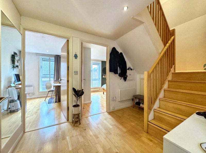 Hard flooring, stairs to the first floor of the flat, under stair storage and an electric heater.
