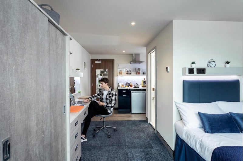 Our Triumph House Platinum studios boast an en-suite bathroom, self-contained fully fitted kitchen, comfy double bed, desk space, wardrobe, 32-inch flatscreen smart TV, kitchen and bedding essentials upon arrival, and superfast Wi-Fi.