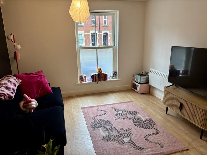 The flat features a spacious open plan kitchen and living area, creating a relaxed shared space to cook and unwind. The living room TV includes Netflix and Prime, both included in the rent.