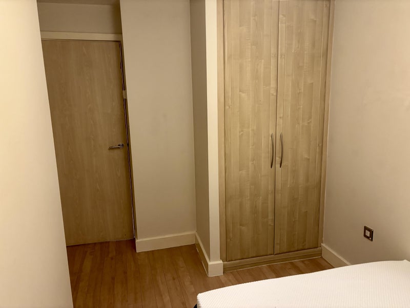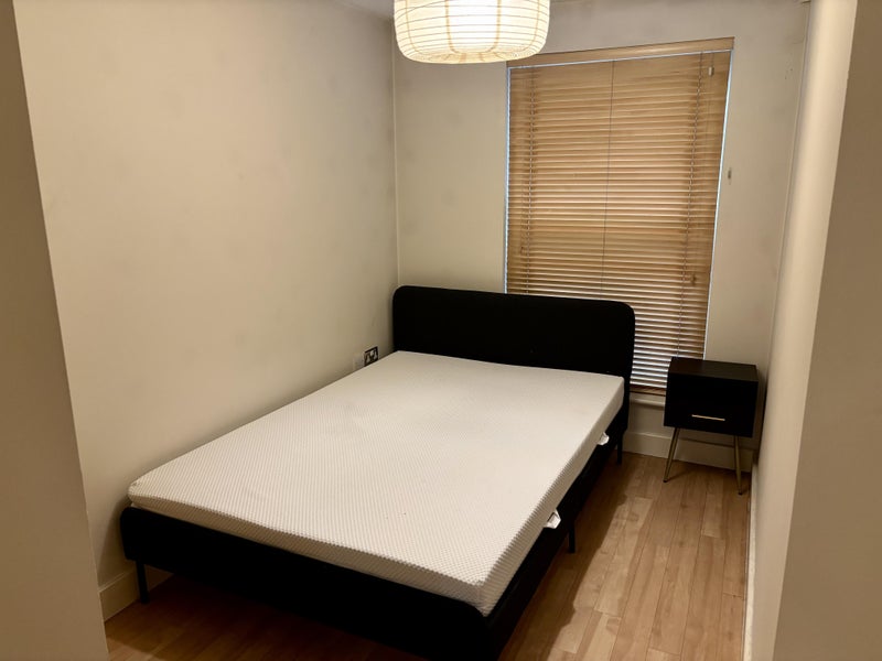 The room comes fully furnished with a double bed, bedside table, and integrated wardrobe space, offering comfortable storage and a cosy place to relax after work.