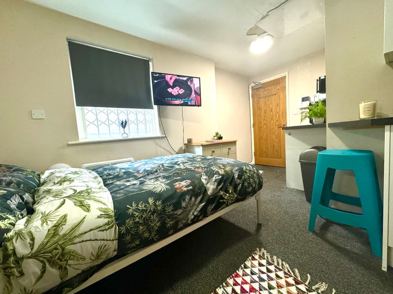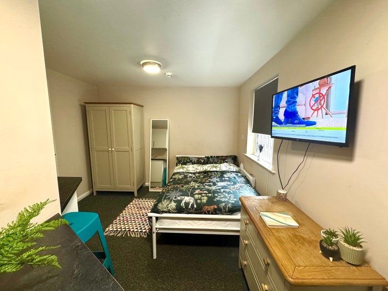 This Studio if offered with a Double Bed, Wardrobe, Chest of Draws and a fitted kitchen area including WHITE GOODS and a kitchen sink! The kitchen also includes a small breakfast bar area for your slow relaxing mornings and evenings. The studio also includes a wall mounted TV! The bathroom is fitted with a modern Toilet, Sink, under sink storage, Mirror and shower! This studio also has a shared outdoor garden space!