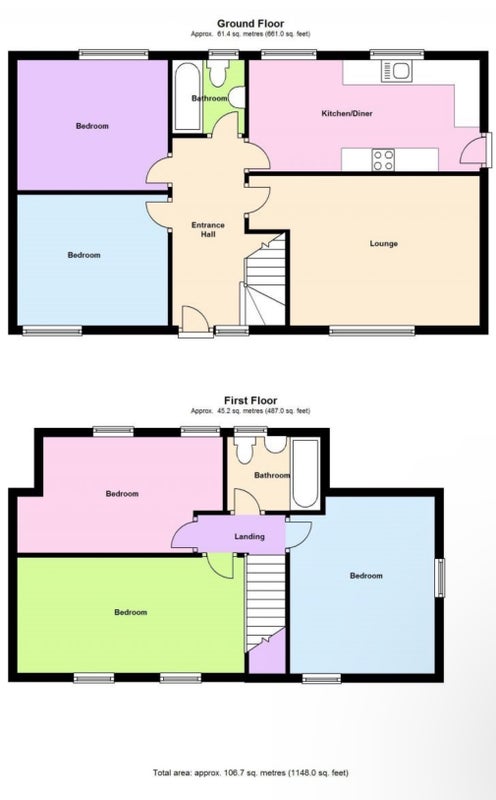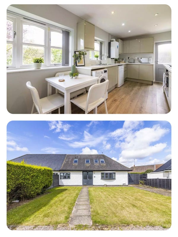 Shown in the floorplan, the bedroom is the bottom left of the ground floor and images of the bedroom, living room, and kitchen space are shown - the front of the house and its massive driveway.