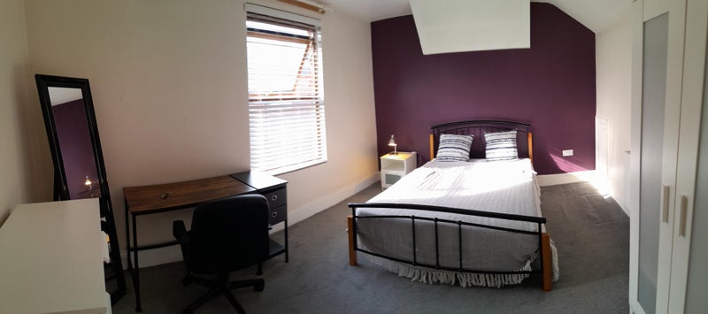 The room is furnished with double bed/hotel standard mattress/wardrobe/chest of drawers/desk/office chair/bedside cabinet and mirror, TV point and own lock for privacy.
