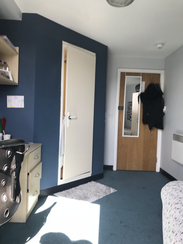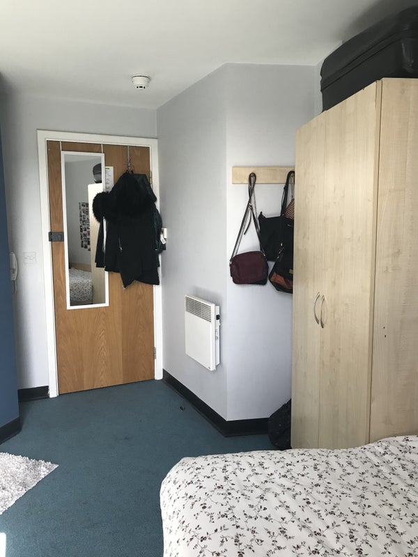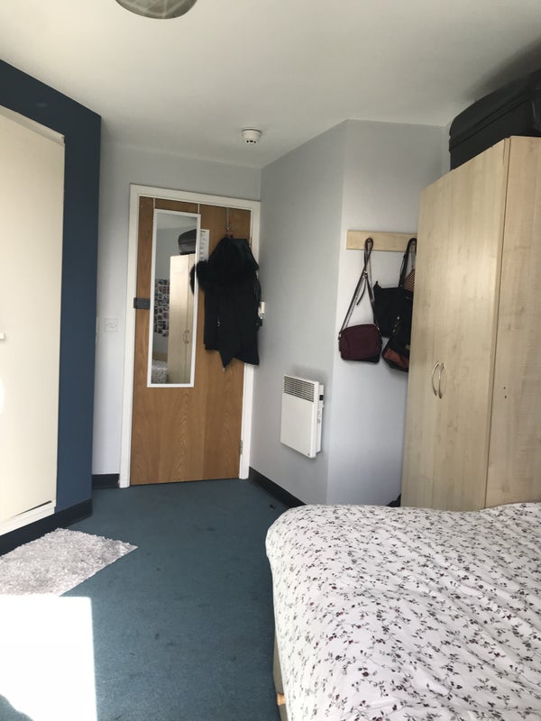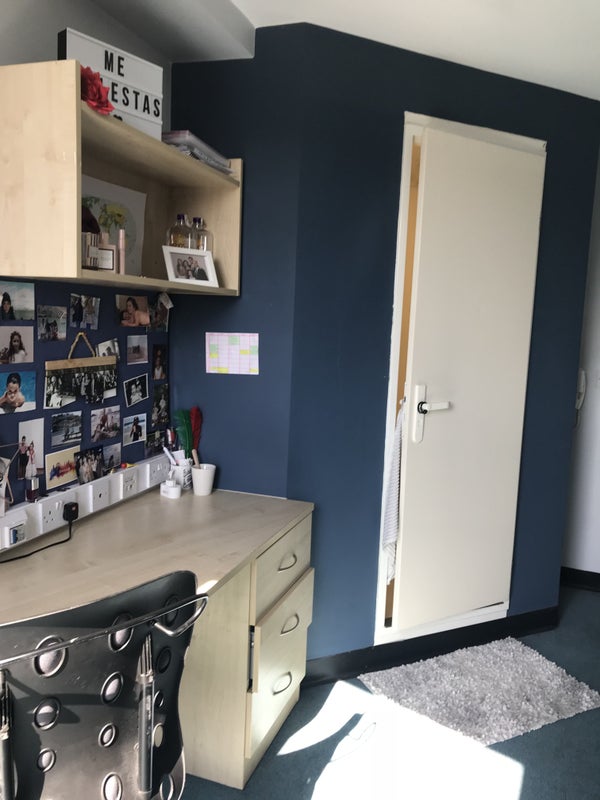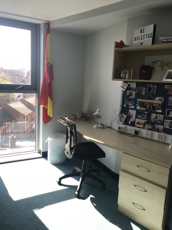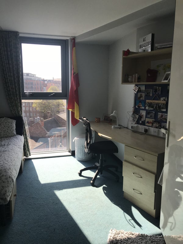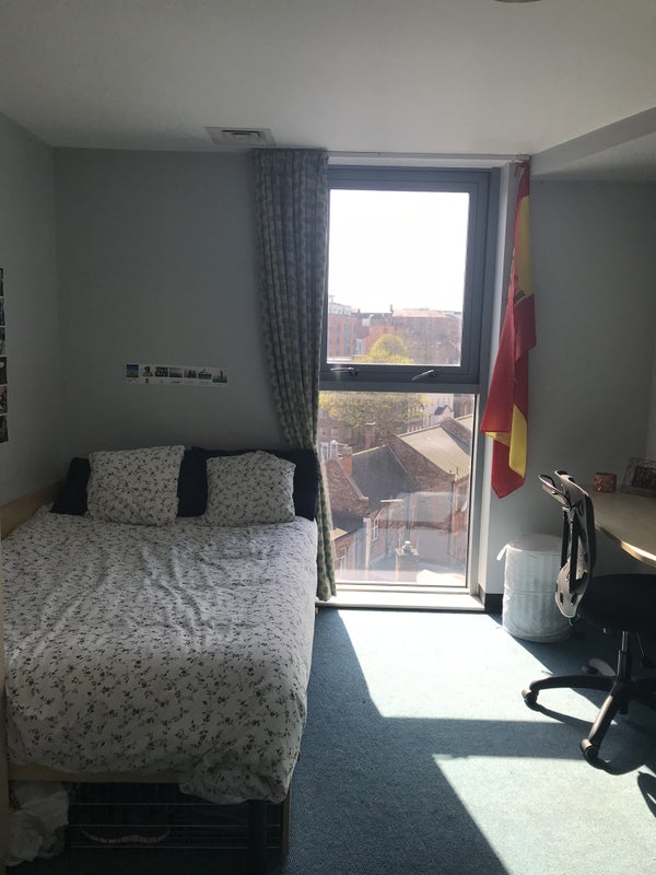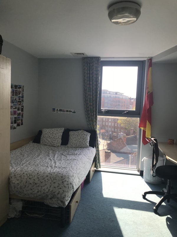 Spacious and bright room with large window to the main avenue. The accommodation is located 5 minutes walk to Old Market Square, in the heart of the city. The room is on the 7th floor of a building of 8 floors, so it has great views. It has its own bathroom and plenty of storage (wardrobe, drawers, shelves...). Double size bed and more storage under it. Large desk.