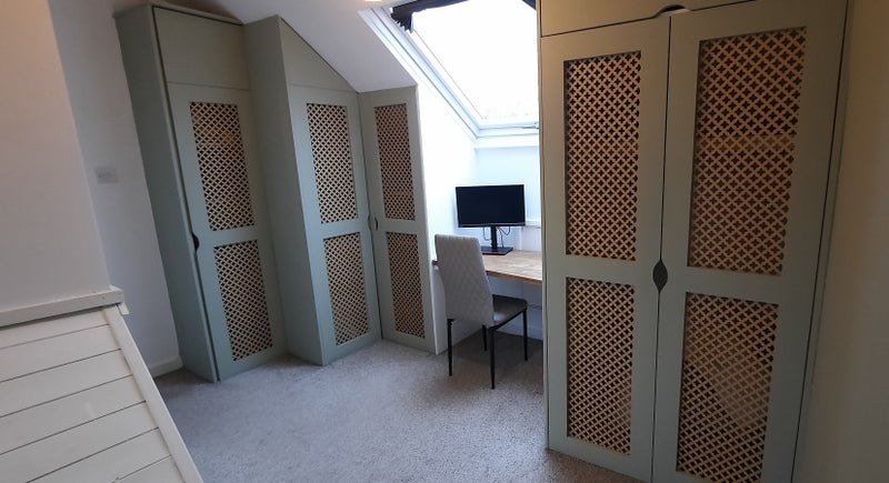 The room is big and bright and fitted with wardrobes, shelves and drawers, an armchair, double bed and desk with chair. You're welcome to bring your own furniture too. The room is on the 2nd floor so may not be suitable for someone with mobility issues.