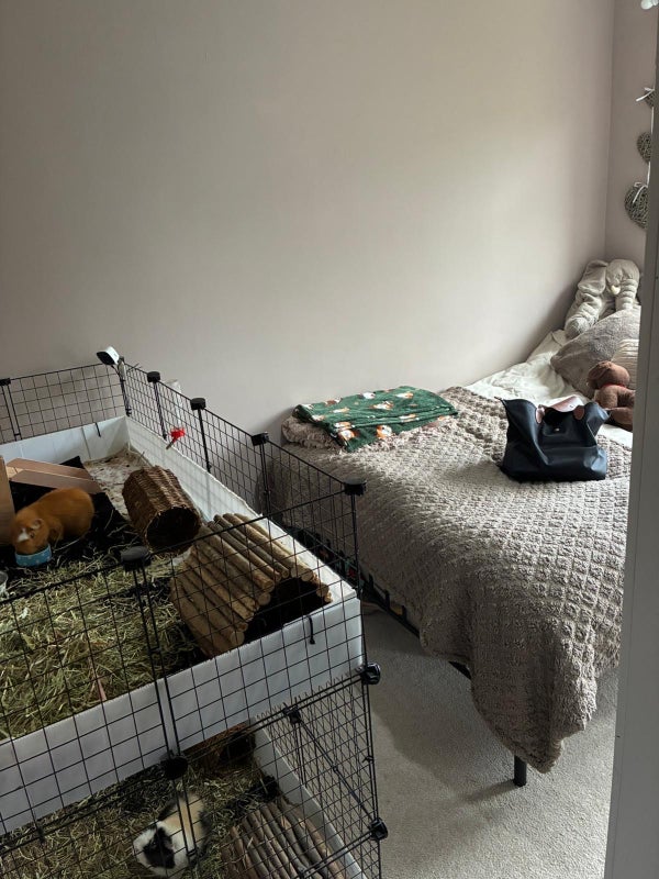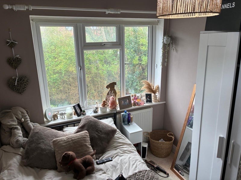 The room is a small double with a bed and wardrobe. I have a large garden, a cosy downstairs area, an upstairs bathroom and a downstairs toilet. There’s also a parking space which will be all yours because I don’t drive!