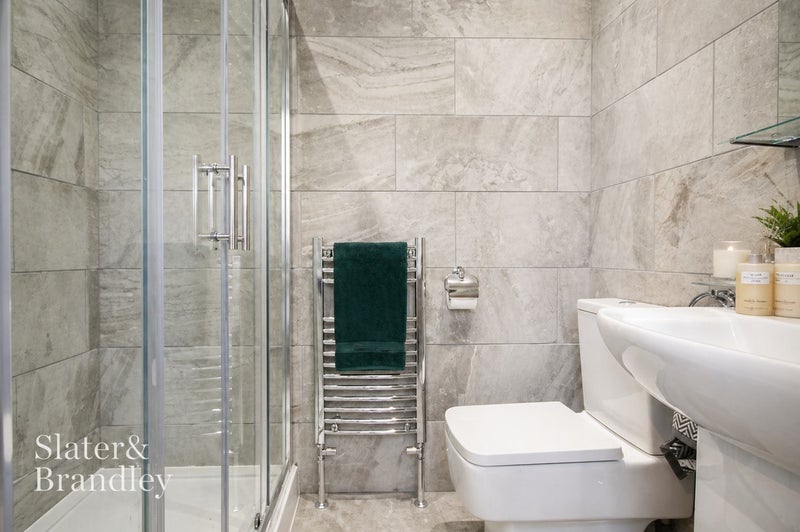 The private en-suite consists of hand basin, extended quadrant shower and toilet and is fully tiled.