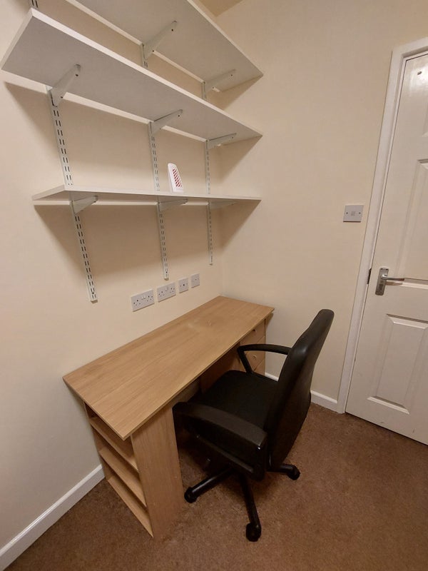 Room includes double bed and mattress, bed side tables and wardrobe and desk. Bedroom door has own secure lockable key set.
