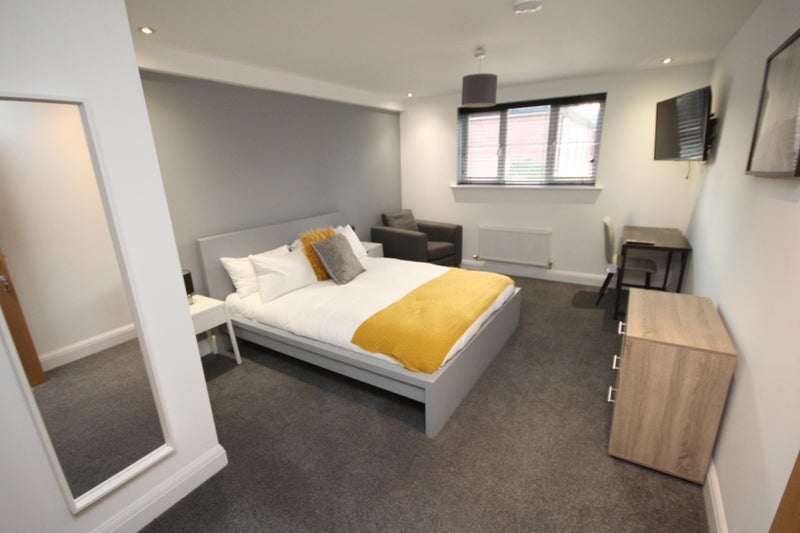 The room is large and beautifully furnished with king-size bed, Matress, bed side cabinets, desk, chair, chest of draws, built in wardrobes, wired super fast broadband, Smart Flat Screen TV, ensuite shower rooms with a sink, mirror and loo.
