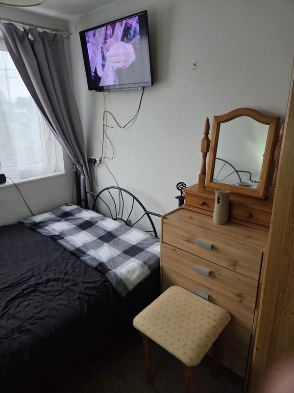 A single furnished room ,with double bed and 32 inch flatscreen TV and free WiFi. All amenities in cluded showe/bath ,use of kitchen, washing machine fridge freezer etc.2 minutes to local convenience store and takeaway. Regular bus every 15 minutes to town. i have a Cavalier King Charles Spaniel dog hes very friendly, likes walks to countryside which is only 10 mins away .off road parking availiable.