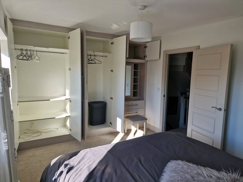 Super King Size bed, TV, built in wardrobes. Sole use of bathroom. Shared living room and kitchen. Town house, walking distance to Bicester Village, Town and both Bicester stations. House is currently for sale, so viewings must always be facilitated.