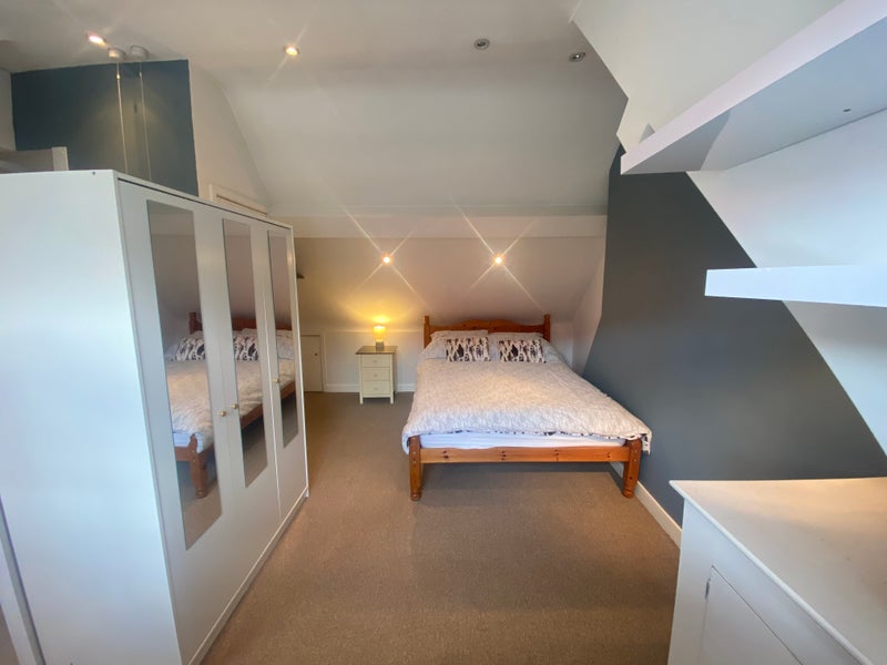 Ample storage including a three door wardrobe, under eaves and desk with lots of shelves for working/getting ready.