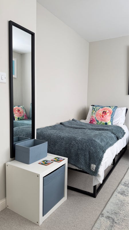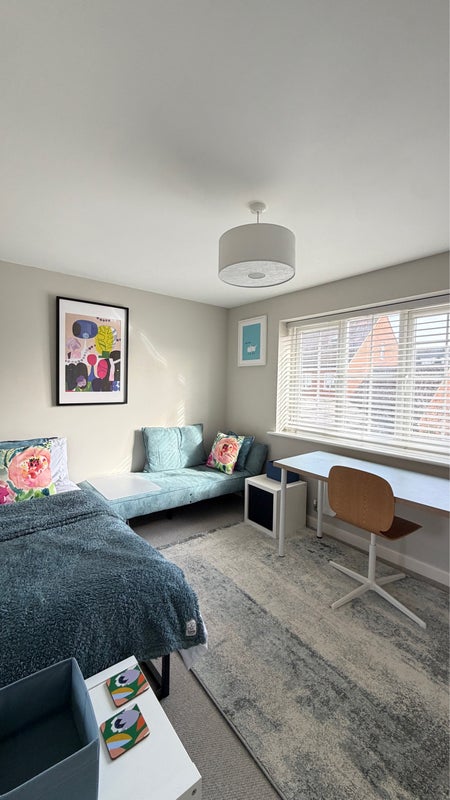 A south facing double bedroom for single occupancy with shared bathroom, large wardrobe, desk and storage. Bedding & linen provided with complimentary shampoo/conditioner, shower gel and cleaning materials. Fully equipped kitchen with complimentary tea, coffee, and sugar