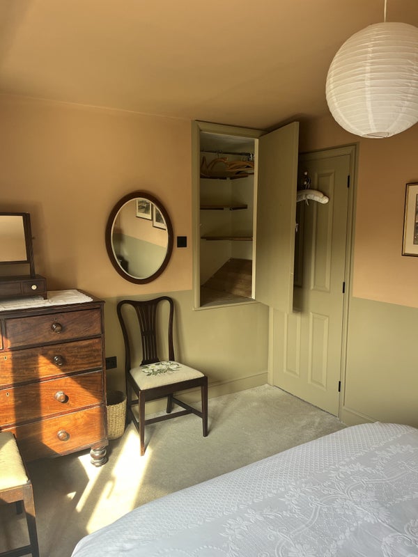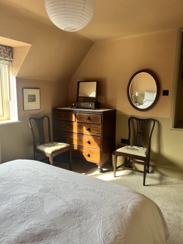 Your space: comfortable 5 ft king size bed in newly decorated room. Large chest of drawers and built in wardrobe.