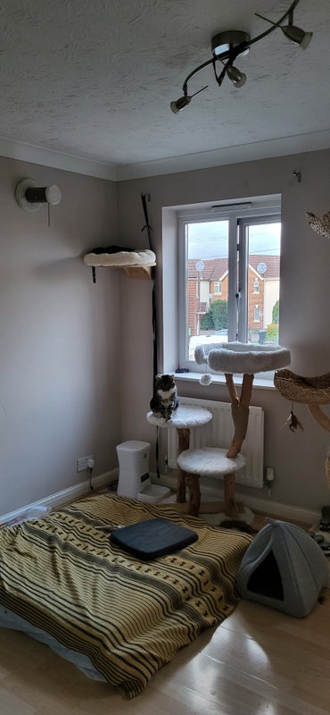 The room is currently being organised, and the type of human and cat furniture in the room will be finalised based on your needs (e. g., bed, cat trees, chair, desk, etc.).