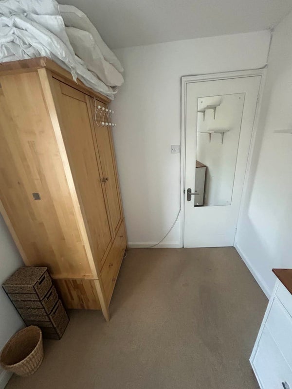 The room is furnished with a double bed, wardrobe and some storage. The house is relaxed and tidy, with a shared bathroom upstairs and an extra toilet downstairs.