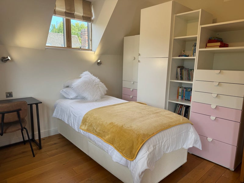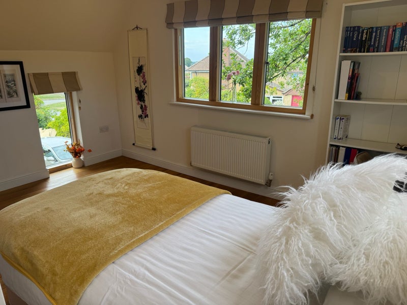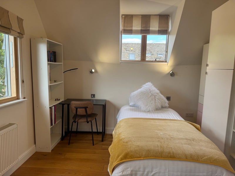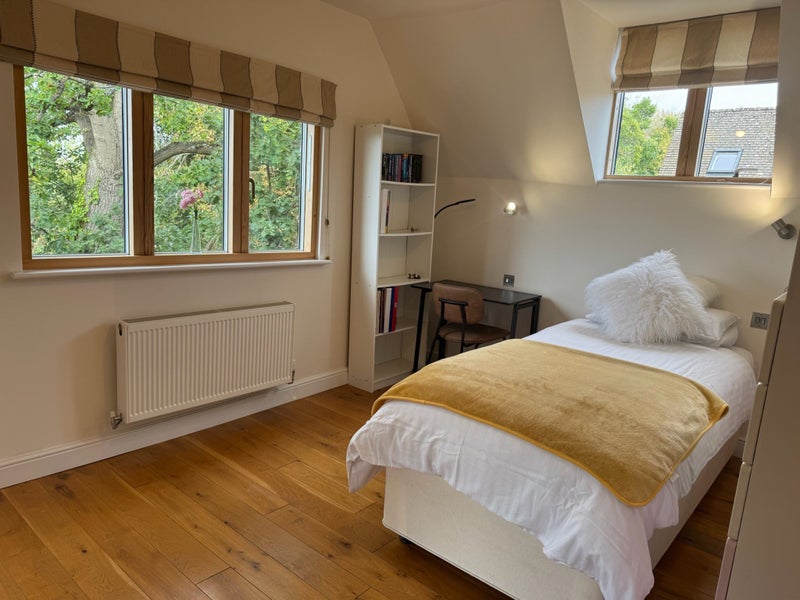 Our stonewall cottage sits at the foot of Shotover Hill, just a 17-minute drive from Oxford city centre. The cottage enjoys fresh countryside air and excellent transport links. We’re offering one of our four bedrooms for rent in Headington (OX3 8EY), ideally located near the JR Hospital and Oxford Brookes University, and only a 20-minute cycle into town. The available room is bright, with windows on three sides and beautiful views.