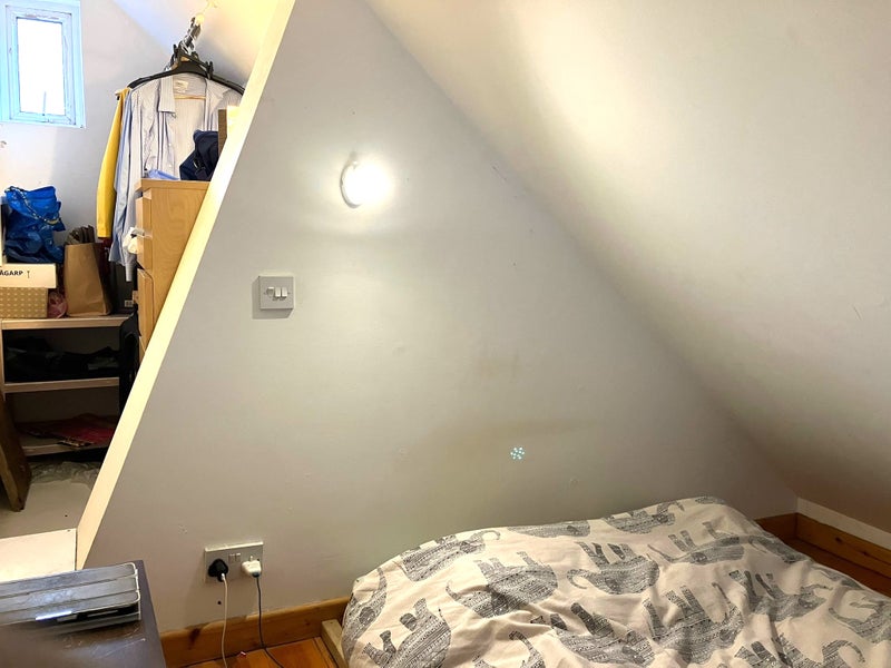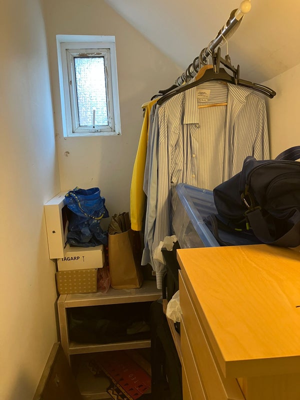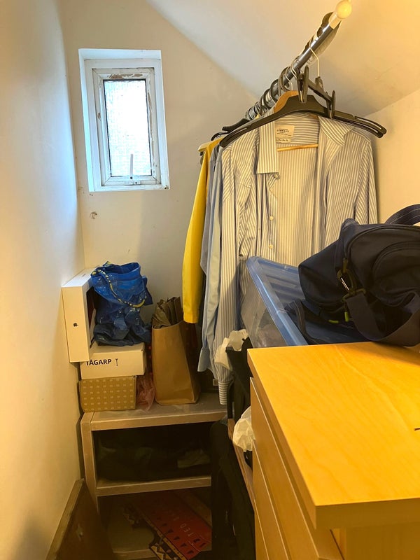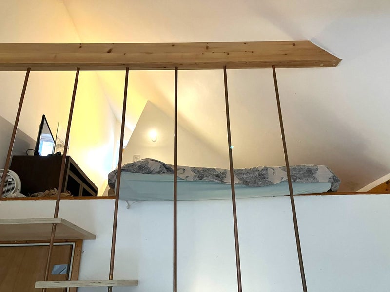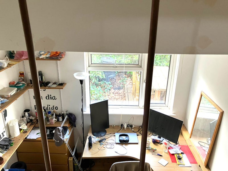 Double levelled room. Desk downstairs and bed and storage upstairs.