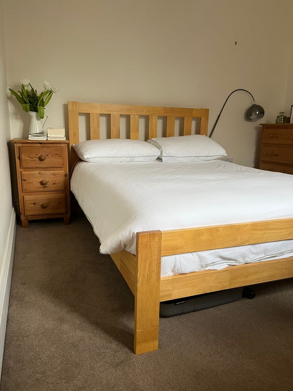 The available first-floor bedroom has a double bed, a built-in wardrobe, a chest of drawers, and good natural light from the window. It shares a bathroom with two other bedrooms (there is a second bathroom downstairs for the other two rooms).