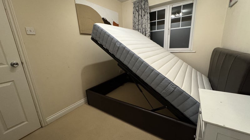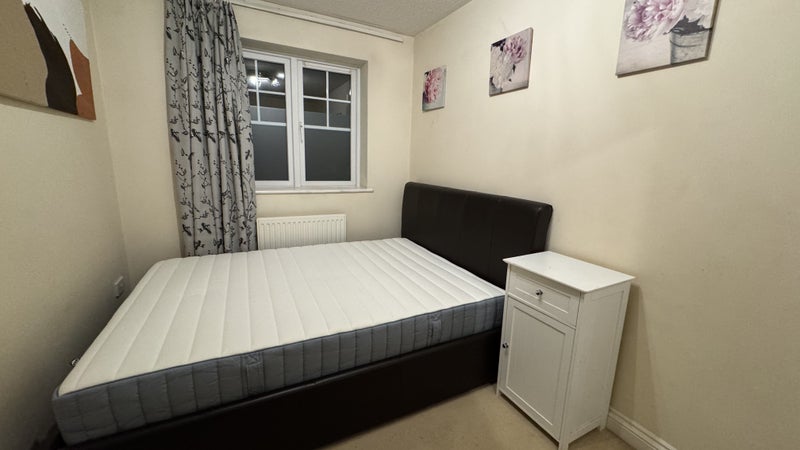 Wardrobe 3 doors, double bed with storage, new mattress, bedside