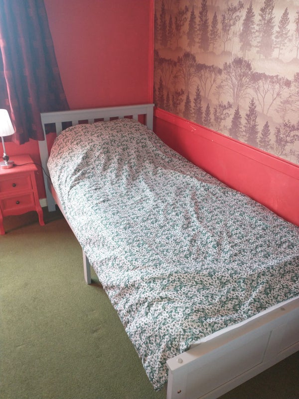 The room is a double in size. It has a single bed, a mirrored wardrobe with drawers, a desk and a swivel chair. We are a quiet household, especially between 11pm and 7 am.