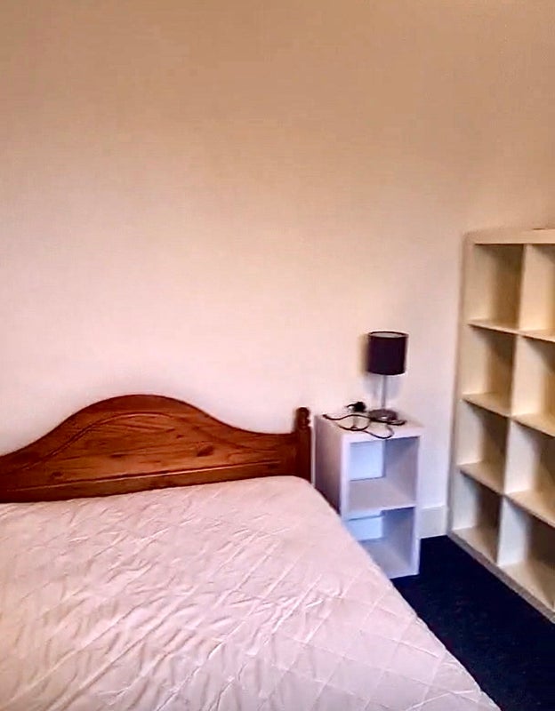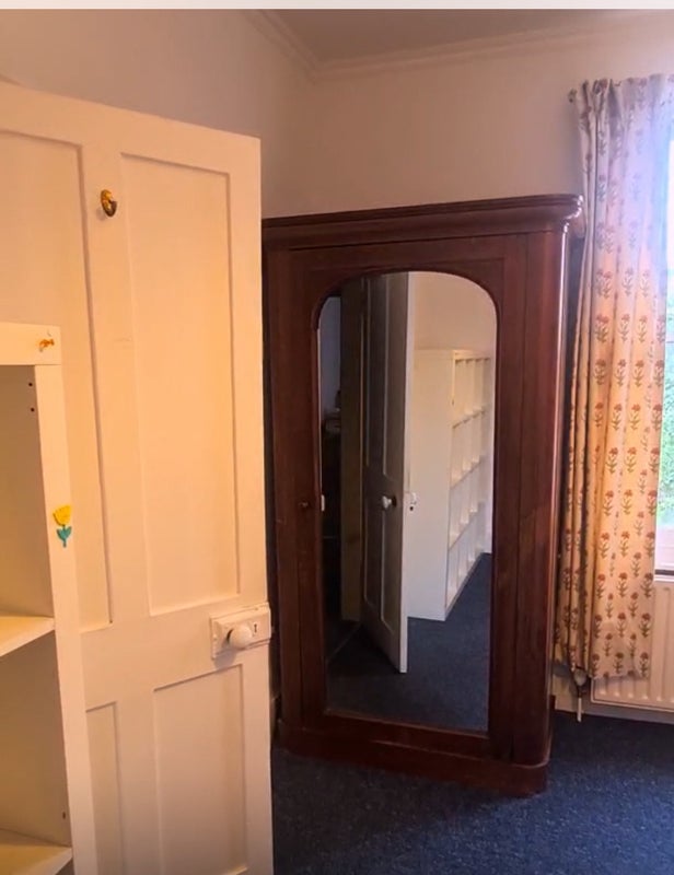Fully furnished bedroom with wardrobe & drawers, lots of shelving and desk with chair — move-in ready!