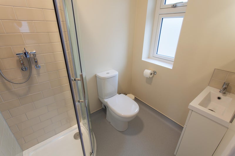 The second room shares a bathroom with one other person (currently male) and features an extra large desk space with good wall shelving for larger screens and desk needs.