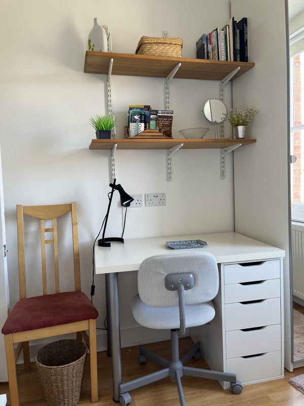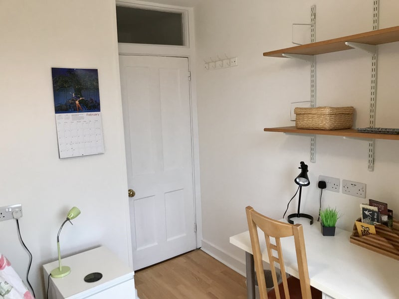 The room has a single bed, wardrobe, desk and chair. It overlooks the garden at the back of the house and is very quiet.