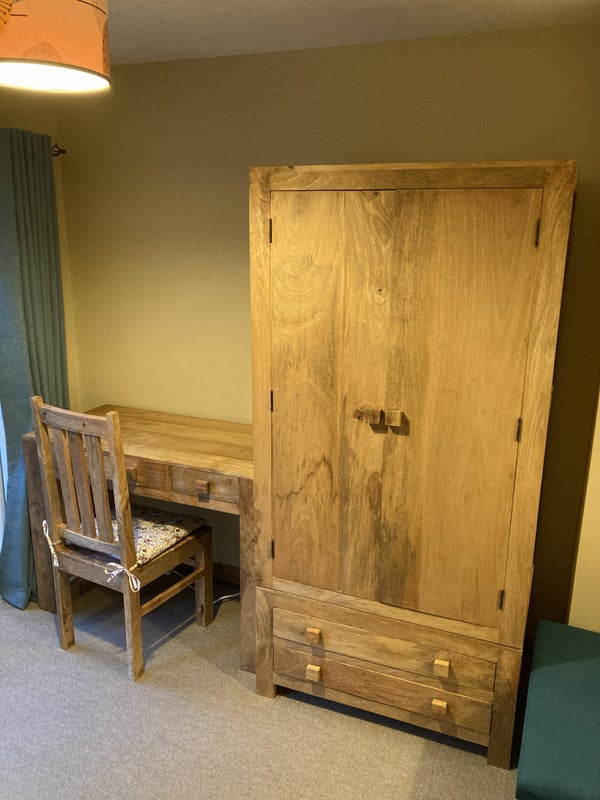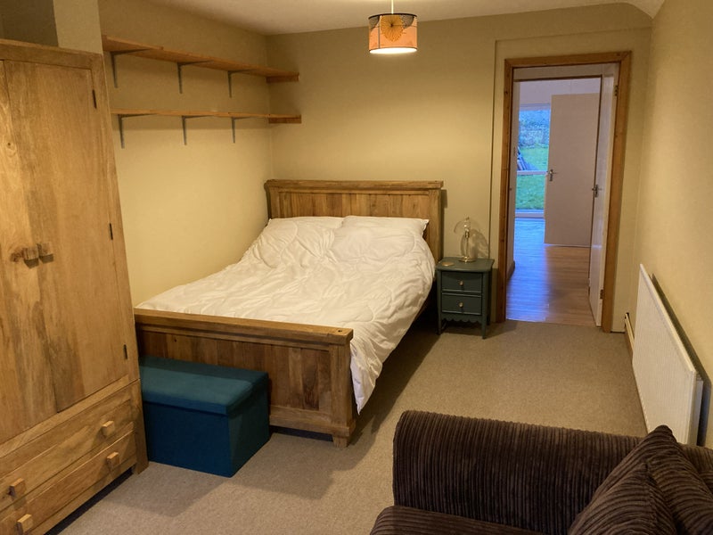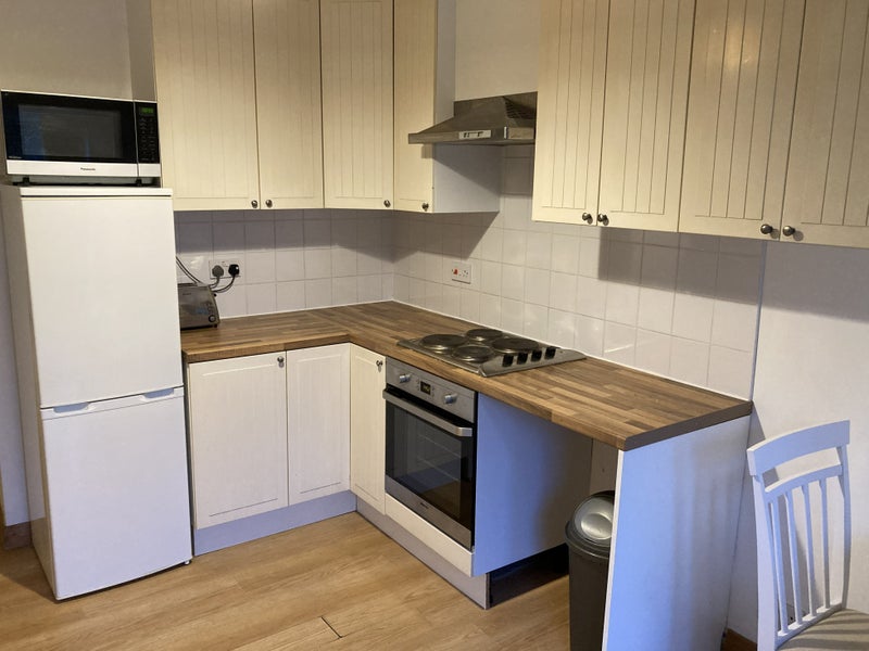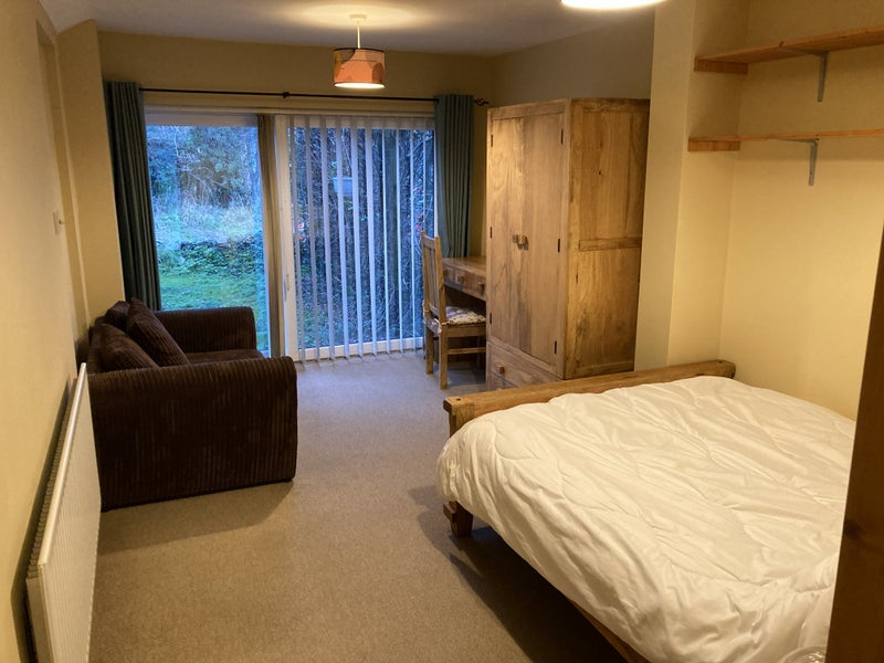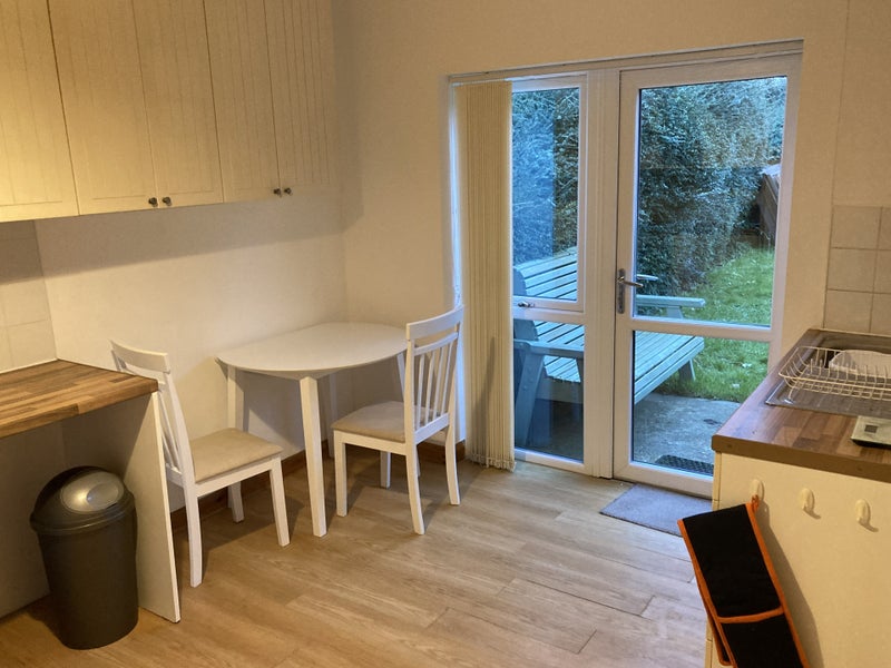We're renting out our one-bed self-contained annexe, which includes a combined bedroom/living room with sofa and desk, a toilet with shower, and a generously sized well-equipped kitchen. Parking on the drive and use of our large garden are included.