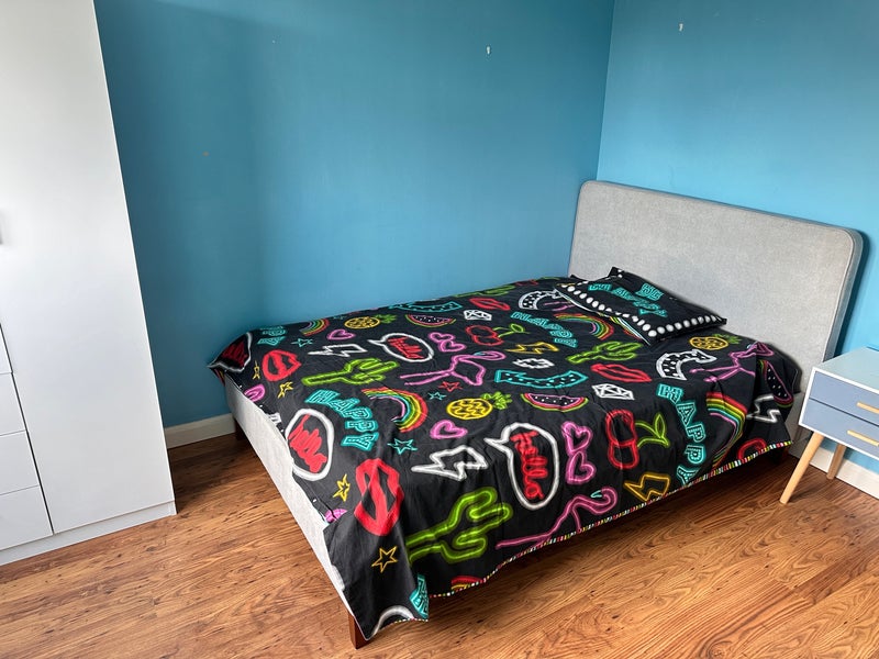 There’s a white wardrobe and a double bed. There’s a chest of drawers and a chair. If you need anything else, let me know.