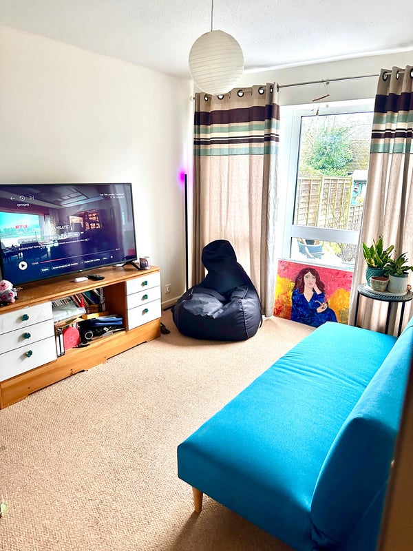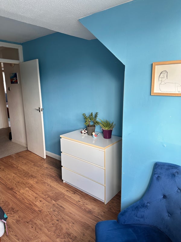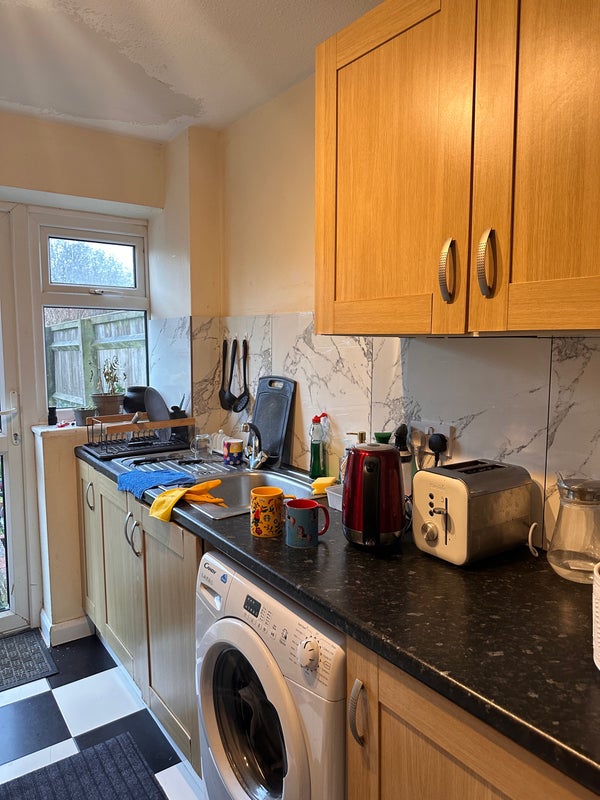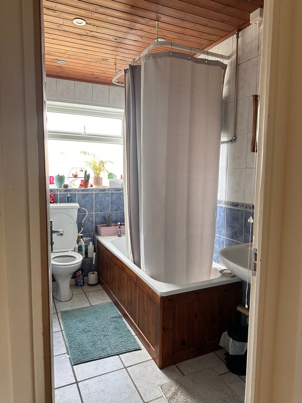 The dining room has a large oak table. There’s one shared bathroom and kitchen. You can also use the garden. Non-smoker only.