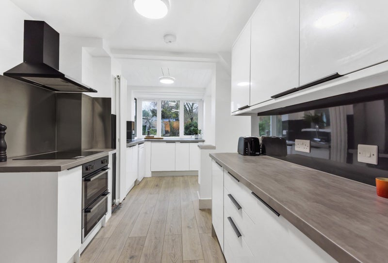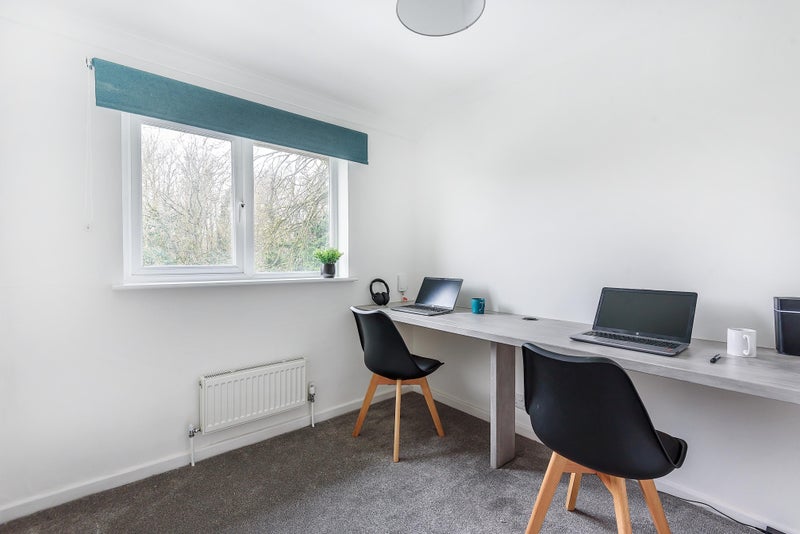 The rear garden is seasonally maintained and has secure bicycle storage.