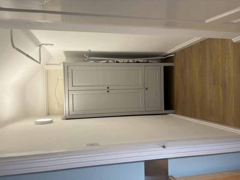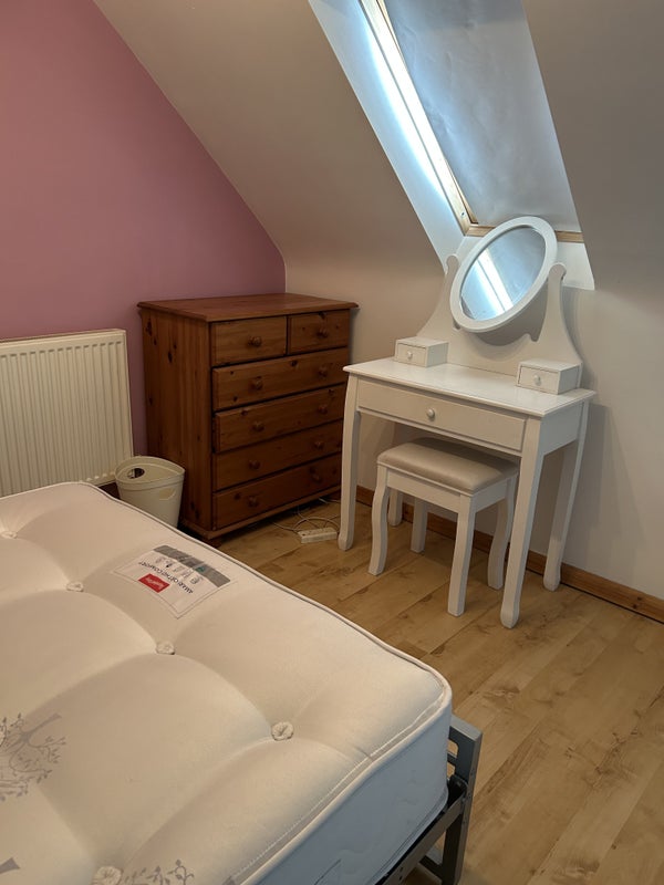 The annexe is furnished and includes a a walk in closet, TV with stand and storage (TV also basic BT package), bed, mattress, chest of drawers, and a vanity unit. There will also be a desk and chair added to the living room in front of the window area, to go along with the monitor.