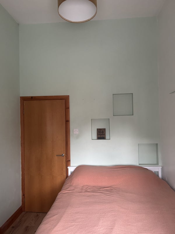 The room has a lovely high ceiling which gives a sense of great space. Supplied is a tall chest of drawers, small wardrobe, Underbed storage space and a king size bed.
