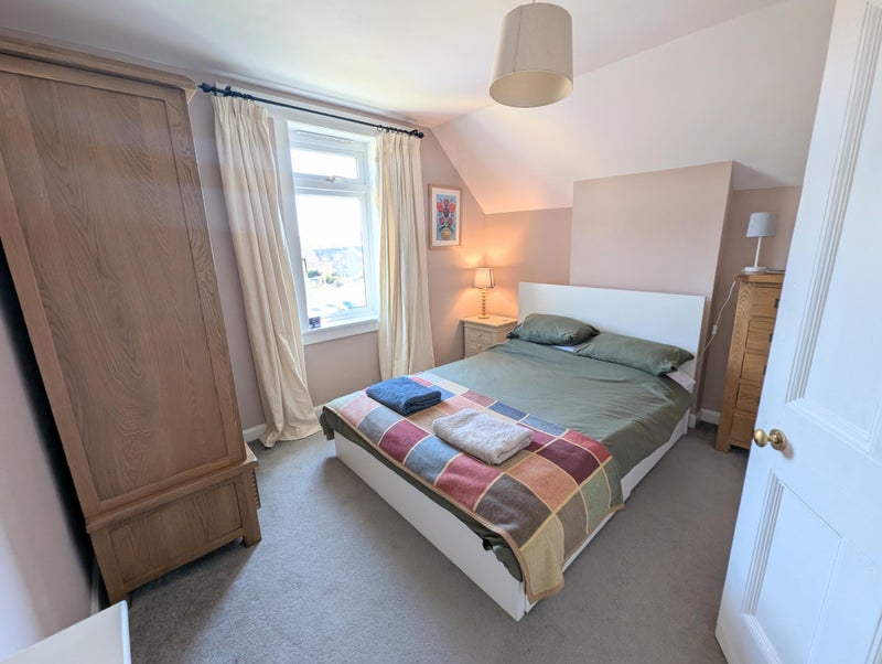The property has three bedrooms, an office, a living room, kitchen, one bathroom with a shower, a further WC, and conservatory. Outside there is garden which has two sheds. It's situated in a quiet part of Peebles but within walking distance to local amenities and with good transport links to Edinburgh. The room is furnished with a double bed (with storage drawers), bedside table, wardrobe, and chest of drawers.