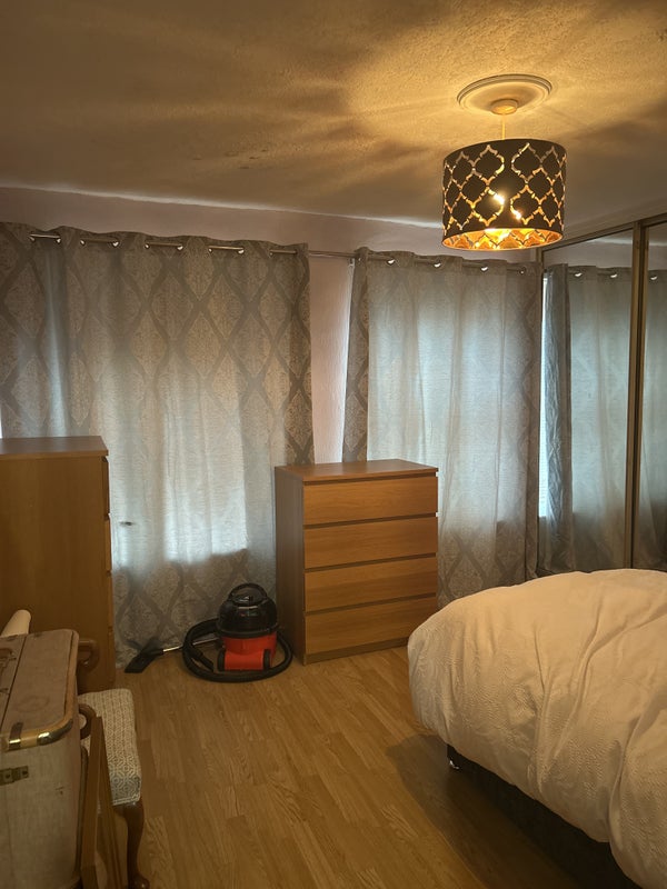 Very large bedroom with two windows and built-in wardrobe, two Chester drawers and a queen size bed, small chair and side table. Own bathroom which is over the landing, large bathroom, deep bath, shower over the bath, sink and toilet with cabinets for storage.