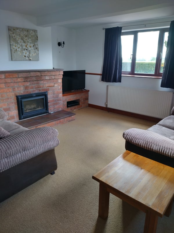 1 large double rooms in a furnished house based up a quiet lane in Astley, Shrewsbury. The house has 2 bedrooms each with a private en suite so no shared bathrooms.