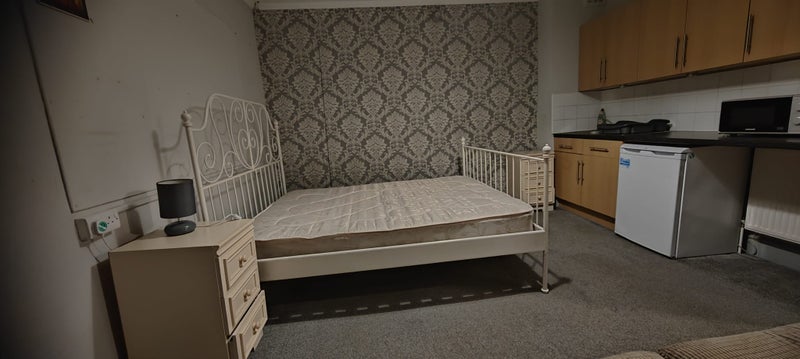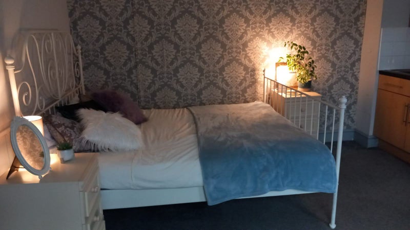 This apartment is a good size, big enough for a double bed, wardrobe, drawers and settee.