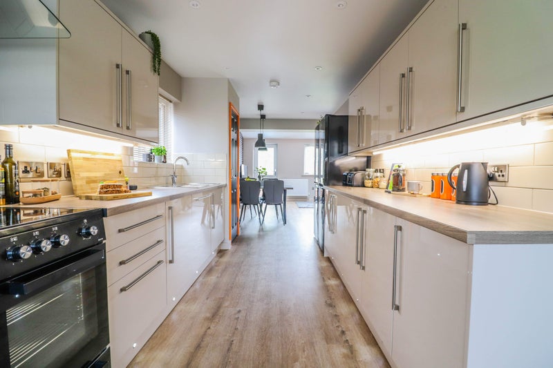 The contemporary kitchen has a table and chairs and ample cupboard space. Everything you could want to prepare your favourite meals after a hard day at the office including a range cooker, microwave, 2 large fridge freezers, dishwasher, toaster etc. You may also be interested to know that the washing machine and dryer are located for your convenience in a separate utility area so as not to impact on your enjoyment of the great communal areas.