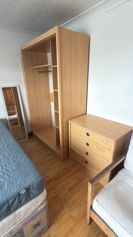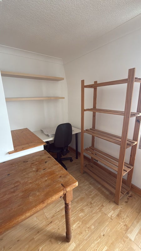 - Furnished (includes closet, two desks, two chairs, shelf, chair, bed and mattress, curtains)